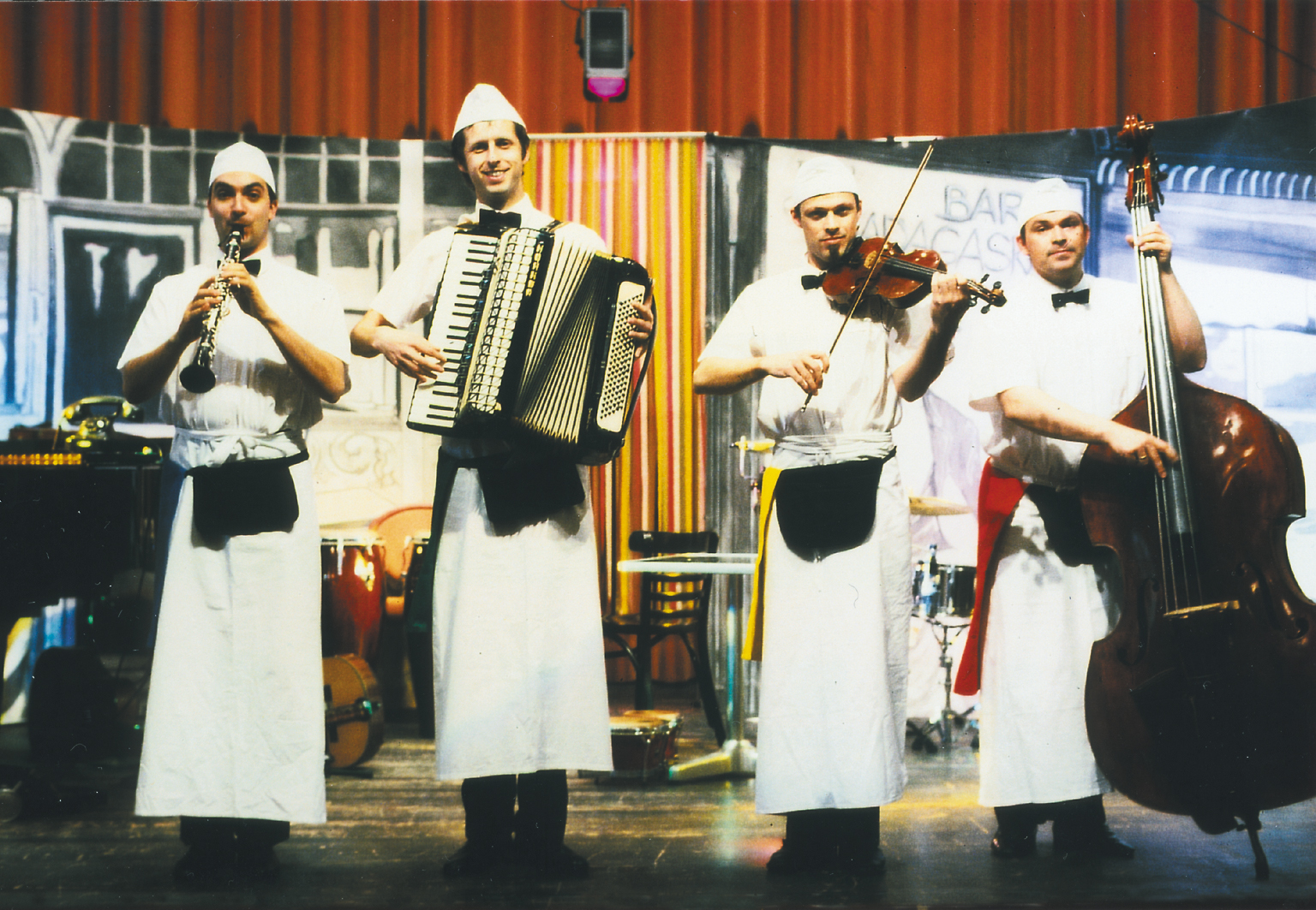 Neunzig Minuten arbeiten die Kellner von TANGO FIVE in der "Bar Madagaskar" und stürzen die Zuhörer in ein erfrischendes Wechselbad unterschiedlichster Musikstile. ... Es entstand ein buntes, aber ausgewogenes Menü aus vielfältigen Situationen und Stimmungen, gewürzt mit Slapsticks und Gags, garniert mit einer Prise Sentimentalität. ... (Pegnitz-Zeitung, Lauf, 31.07.2001)
