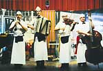 ... die musikalischen Multitalente Gregor und Veit Hübner (Jazz- und Klassiker-Musiker), Karl Albrecht Fischer (Film- und Theatermusiker) und Bernd Ruf (u.a. Dirigent der Stuttgarter Philharmoniker) hatten ja zuvor viele musikalischen Stilrichtungen ohne Hemmungen in einem mehrgängigen Menü perfekt serviert, schmalzigen Schlager an französischen Chansons, dazu kernigen Ragtime mit scharfer Salsa und leidenschaftlichen Tango mit gefühlvollen Chorgesängen mariniert. Bernd Ruf brillierte mit Klarinette und Saxophon, Gregor Hübner ließ seine Geige weisen und jubilieren, sein Bruder Veit hatte den Bass im Griff und Karl Albrecht Fischers Können war nicht nur am Flügel zu hören. ... (Mittelbadische Zeitung, 06.12.1999)